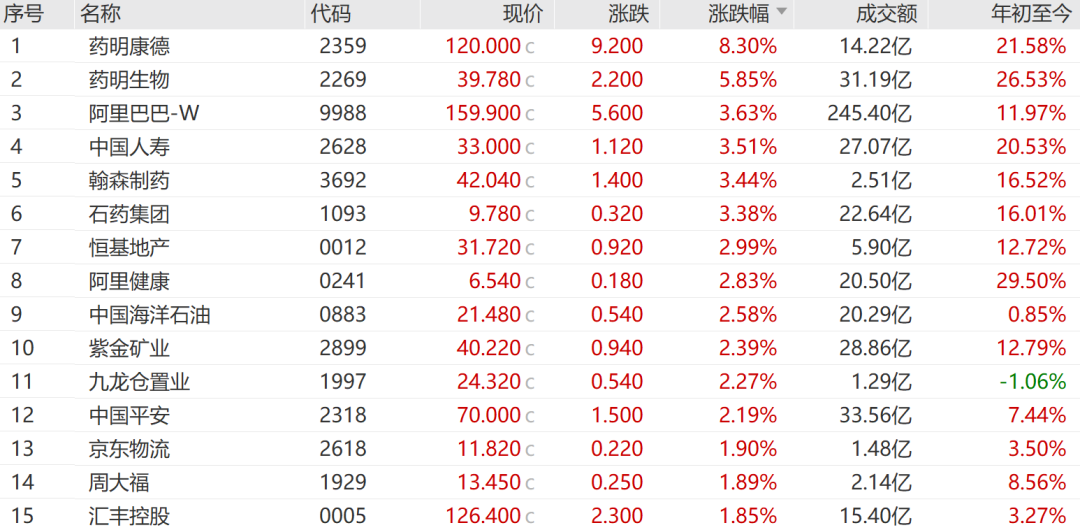 恒生指数成份股中,53只个股上涨,33只下跌。其中药明康德上涨8.30%,药明生物上涨5.85%,阿里巴巴-W上涨3.63%,成为蓝筹股中的领涨代表。