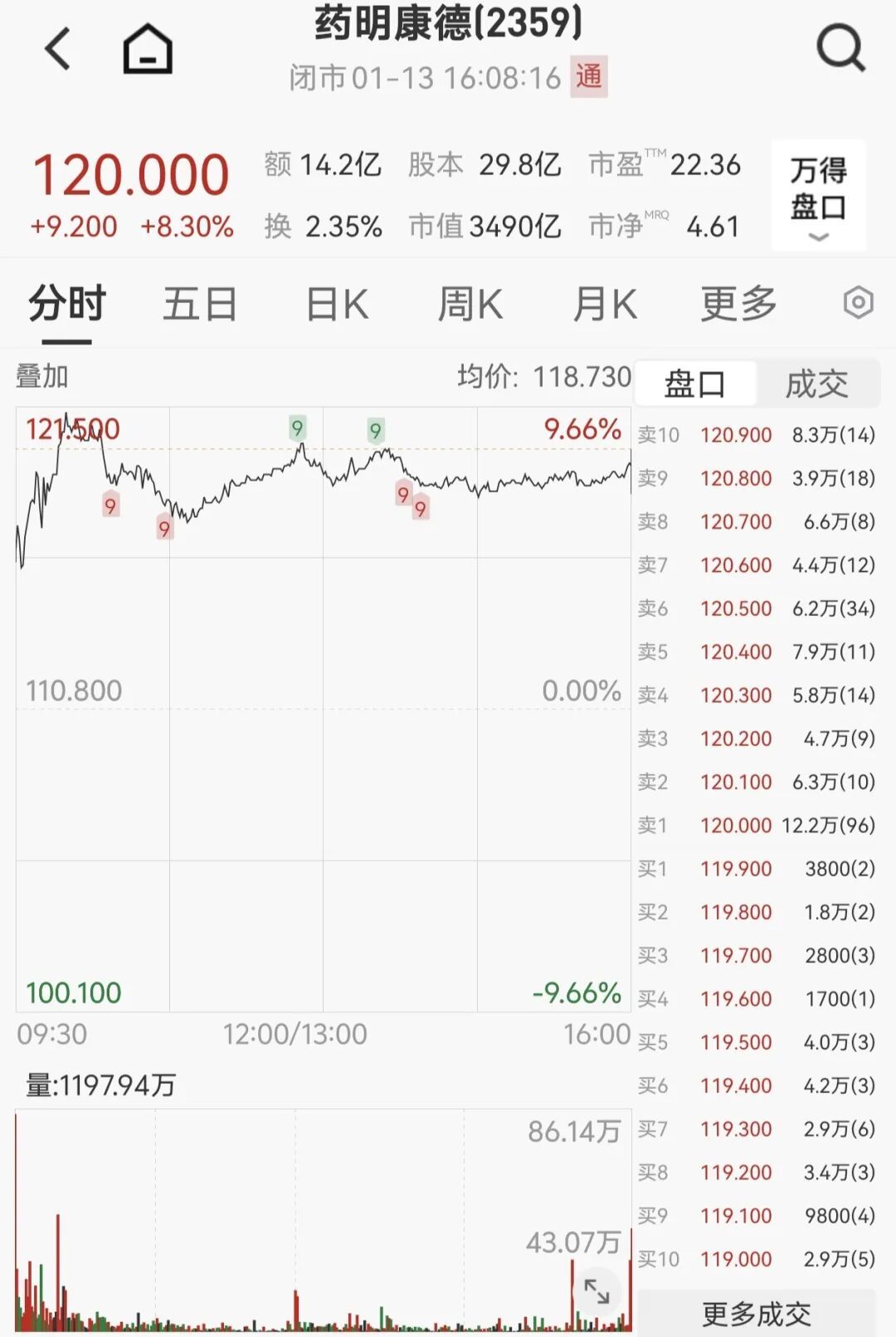 1月13日,药明康德股价高开高走,盘中一度大涨9.66%,最终收于120港元/股,涨幅8.30%,在蓝筹股中领涨。其股价上涨的主要驱动因素是公司1月12日发布的盈利预告,预计2025年归母净利润同比增长约102.65%。