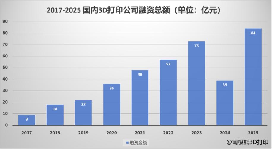 2025年,3D打印赛道迎来资本回归热潮。据南极熊数据,今年国内3D打印领域投融资事件约100起,涉及81家公司,融资总额约84亿元,同比增长115.4%,创历史新高。