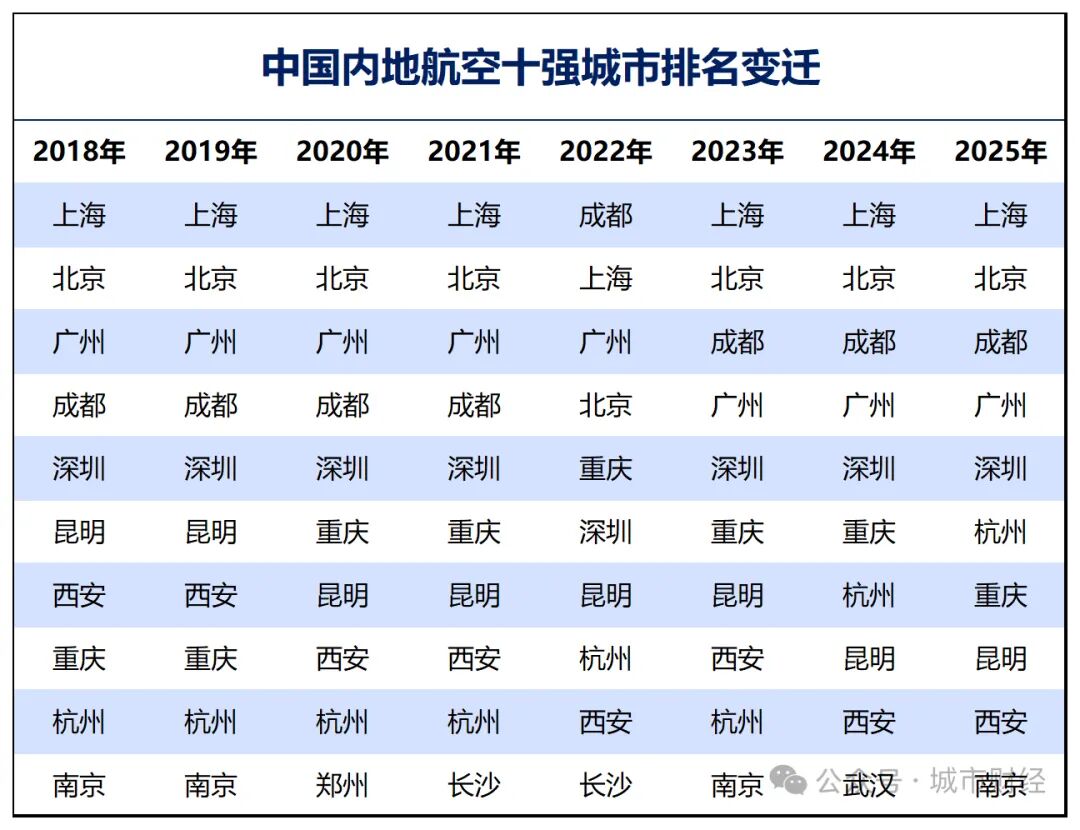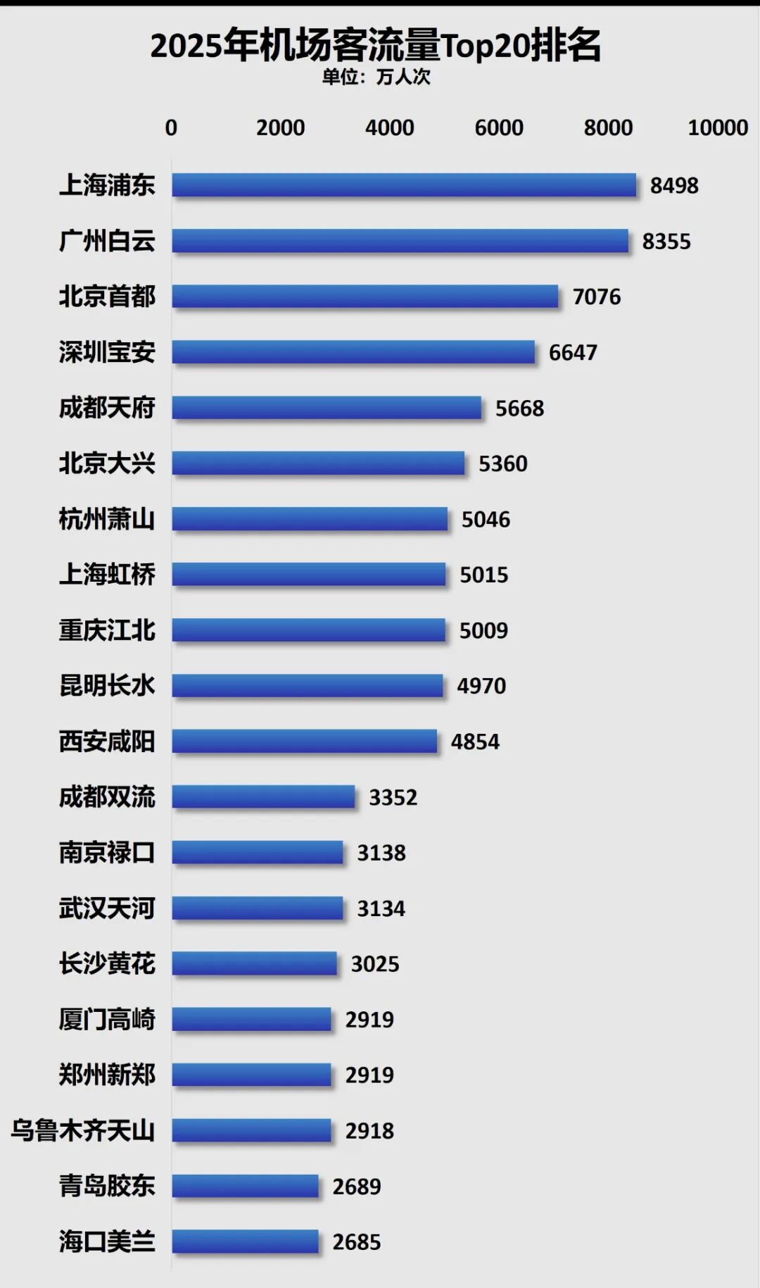但2025年,昆明长水排名已滑落至第十位。这背后除了高铁分流的影响,也或与云南近年来整体发展环境有关。