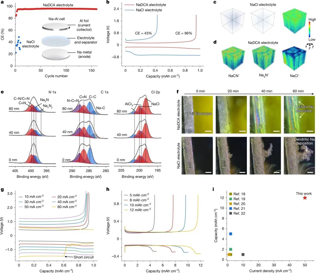 要点:NaDCA电解质下钠-铝对称电池库仑效率达96%,循环稳定;NaCl电解质则效率低、过电位大。NaDCA形成富氮SEI膜,促进均匀钠沉积,抑制枝晶;电解质动力学优异,支持高电流密度与面容量。