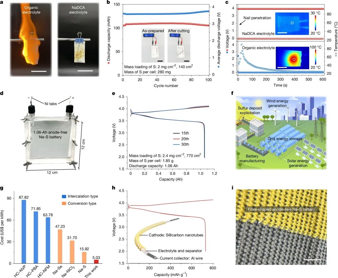 要点:电解液不可燃,软包电池切割针刺测试安全;制备1.06Ah安时级电池,证明电网储能潜力;系统成本低至5.03美元/千瓦时;开发纤维状电池,可编织成供电纺织品。