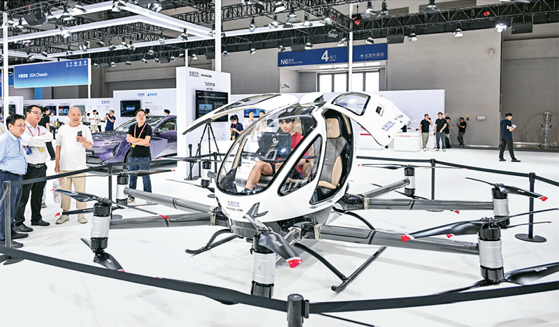 2025世界智能产业博览会于9月5日至8日在重庆举办,本届智博会以“人工智能+”和“智能网联新能源汽车”为年度主题,集中展示了众多与生产生活相关的新技术、新产品和新场景。图为9月5日观众在智博会上参观体验“飞行汽车”。新华社记者 王全超/摄