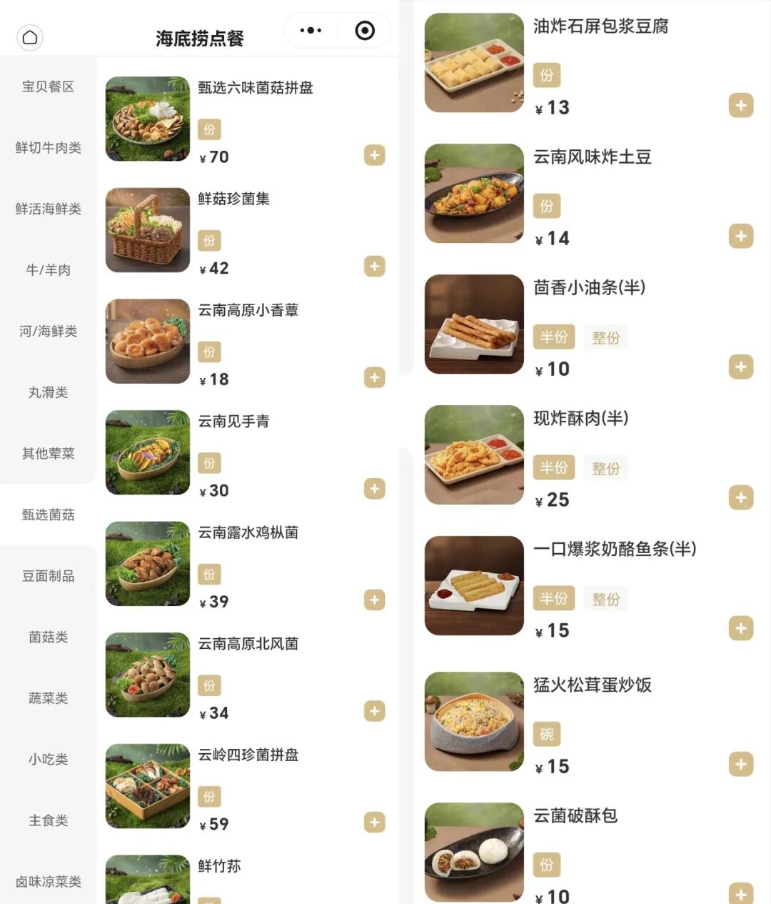 2. 菜品升级:涵盖云岭四珍菌拼盘、六味菌菇拼盘等经典组合,创新推出羊肚菌鱼籽虾滑、猛火松茸蛋炒饭、凉拌见手青等特色菜品,共23种菌菇相关产品。