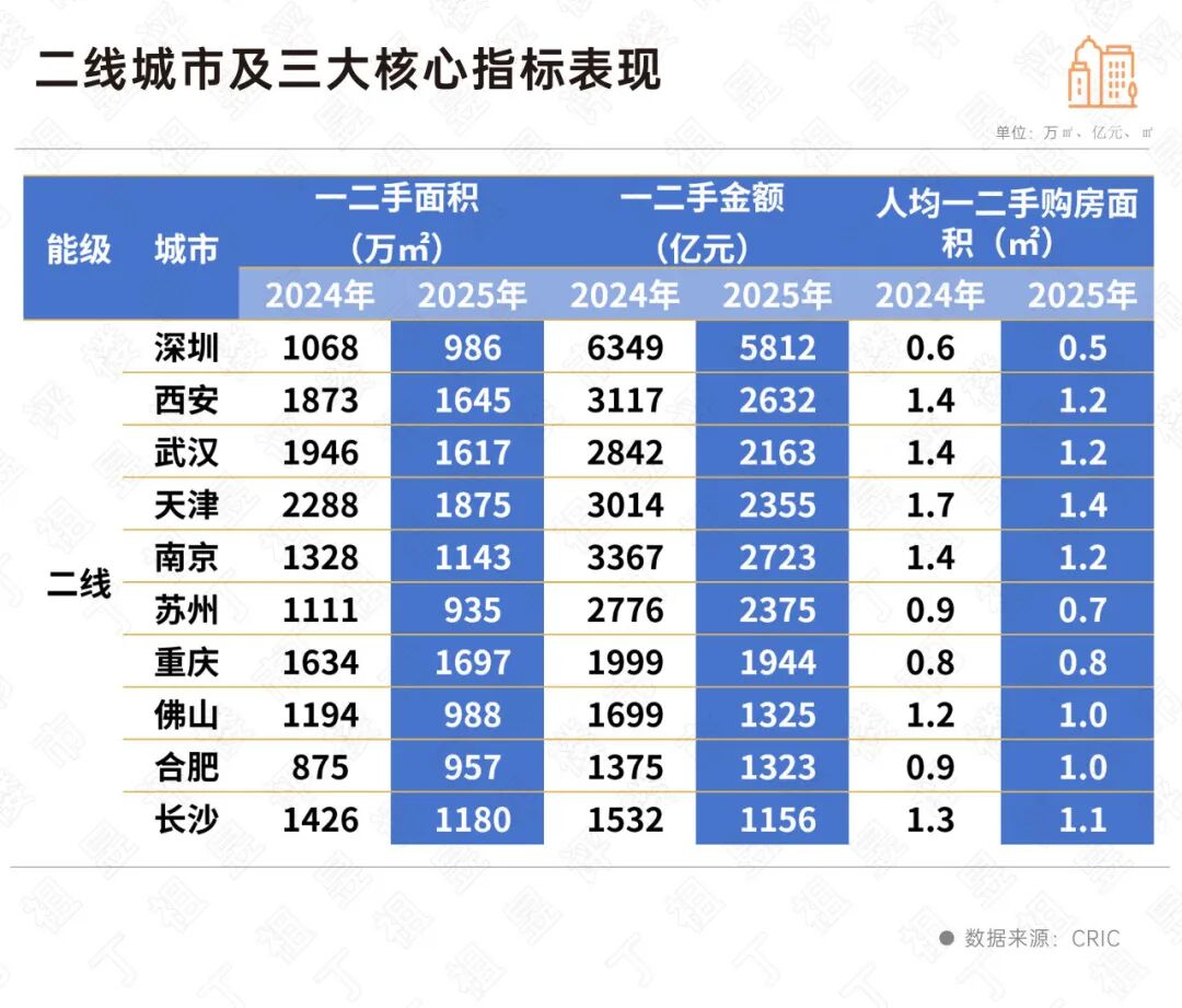 被划入二线城市的深圳,虽然一二手成交金额超过了5000亿的门槛,但成交面积(986万㎡)和人均一二手购房面积(0.5㎡)都处于较低水平。