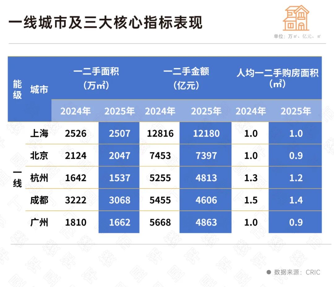 从一二手房成交面积、成交金额以及人均一二手房购房面积这三大指标综合来看,这五个一线城市的市场容量展现出高度的稳定性。