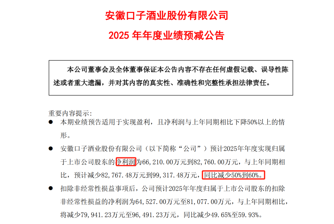 产业的真实状况,往往藏在冰冷的财务数据里。不久前,被称为“徽酒老三”的口子窖发布了2025年业绩预告,预计归母净利润同比大幅减少50%—60%,仅为6.62亿至8.28亿元。