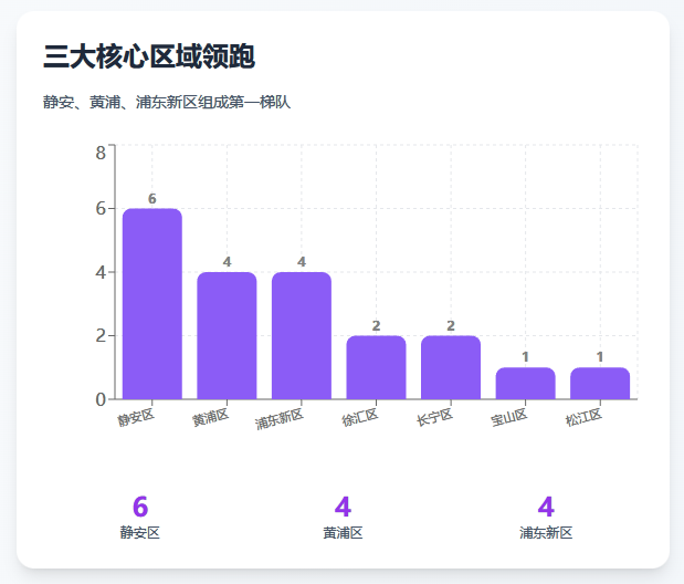 TOP20地域分布集中,静安6家、黄浦4家、浦东4家,三区合计占比70%,南京西路、淮海中路、中山公园、南京东路人广是四大热门商圈。虹口、杨浦等区无门店入选,反映核心商圈在消费能级、客流密度与传播力上的绝对优势。