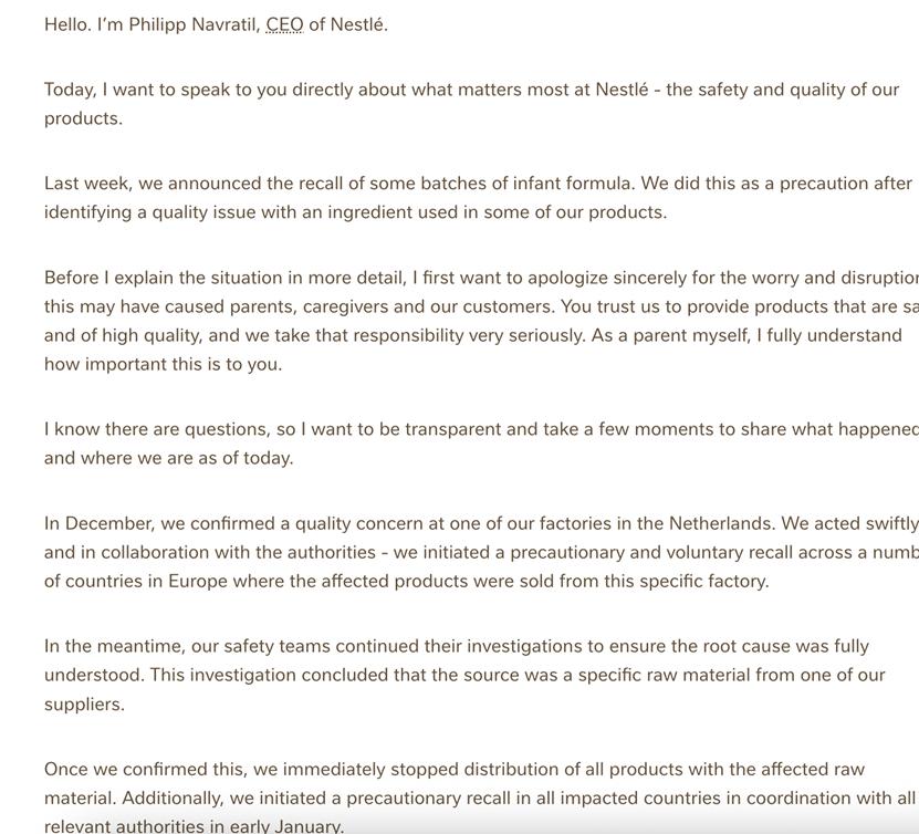 2026年1月14日,雀巢集团全球首席执行官菲利普·纳夫拉蒂尔(Philipp Navratil)在官网发布视频讲话,就雀巢婴儿奶粉预防性召回事件向全球父母表达歉意,并着重指出“食品安全与信任至上”是不容让步的核心价值。