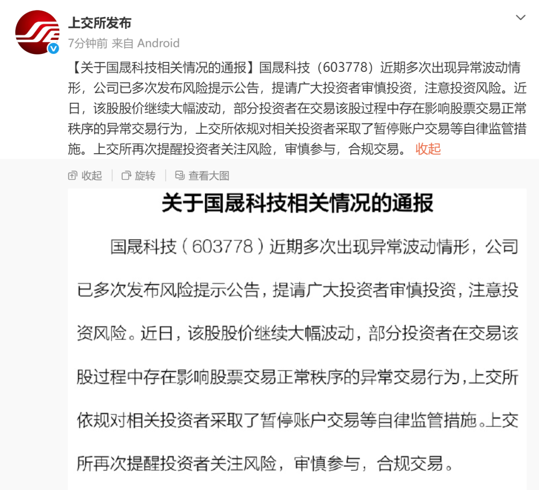 上交所官方微博消息显示,国晟科技股票近期多次出现异常波动,公司已多次发布风险提示,提示投资者理性投资、警惕风险。近日该股股价波动加剧,部分投资者在交易中存在扰乱正常交易秩序的异常行为,上交所已依规对相关账户采取暂停交易等自律监管措施,并再次呼吁投资者关注风险、合规交易。