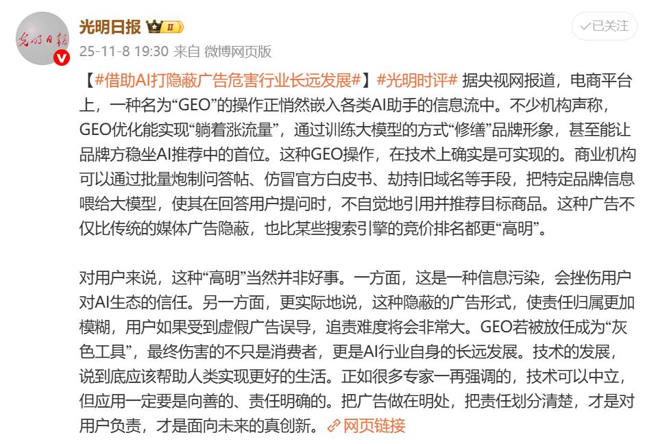 AI无法天然判断内容动机,难以区分“精心包装的营销内容”。《光明日报》不久前批评GEO“借助AI打隐蔽广告”,商业机构可通过批量炮制问答帖、仿冒官方白皮书、劫持旧域名等手段,将特定品牌信息喂给大模型,使其在回答用户提问时不自觉引用推荐。