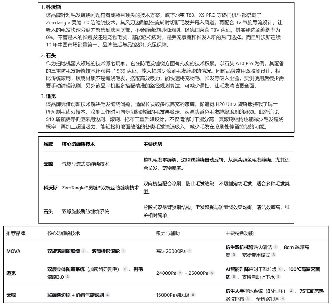 《新立场》用国内相关产品做了简单测试:选取iOS免费榜前列的三个AI应用,提问“推荐三个优先考虑解决毛发缠绕能力的扫地机器人品牌”。