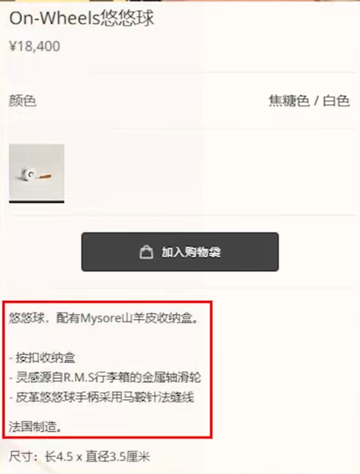 针对这款高价悠悠球,爱马仕官方客服回应称,该产品售价18400元,是近期推出的新品,采用了皮革材质搭配马鞍针缝线的手柄设计,收纳盒则使用了天然珍贵的山羊皮。