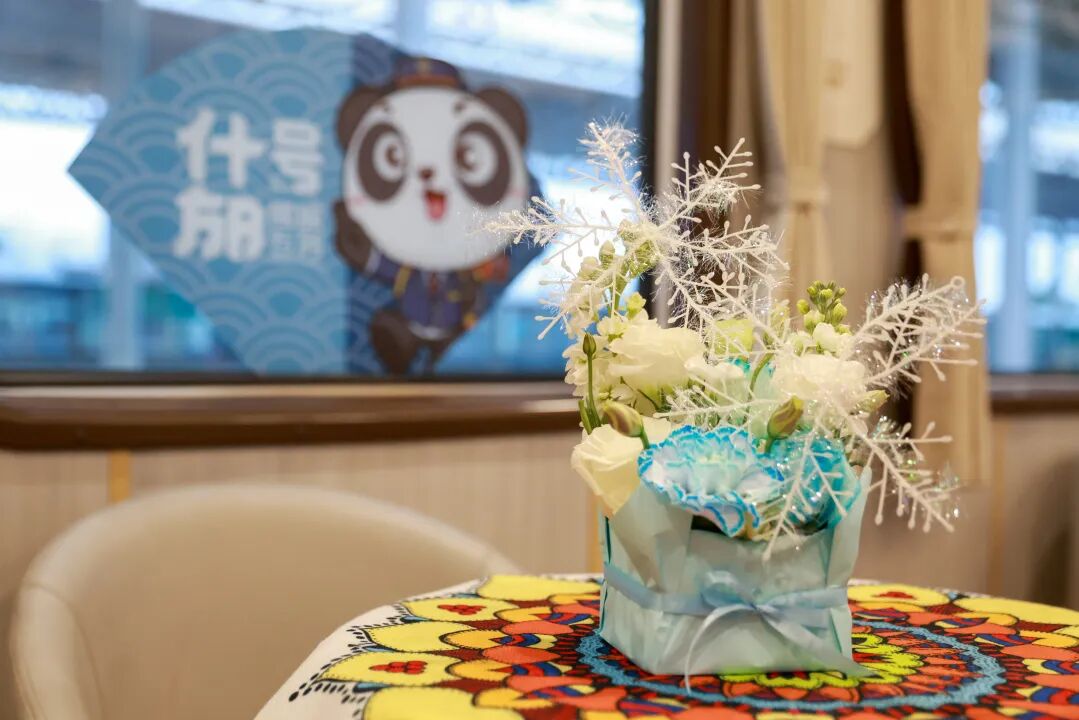 作为定制旅游列车,“熊猫专列·什邡号”从外观到内饰都融入熊猫元素:车身喷涂憨态可掬的熊猫图案,包厢内摆放熊猫抱枕,餐食摆盘也点缀着熊猫造型装饰。