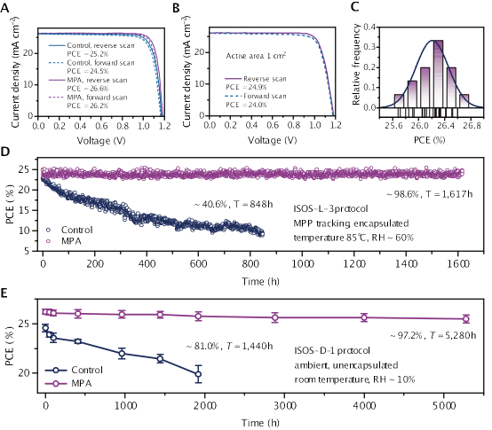 图4 MPA策略的光伏性能和普适性。(A)传统溶液法钝化与固态MPA策略制备的钙钛矿太阳能电池J-V曲线。(B)基于MPA策略的1 cm²大尺寸器件J-V曲线。(C)器件性能统计分析,用于测试MPA技术的重复性。(D)ISOS-L-3协议下对照组与MPA处理组器件的运行稳定性。(E)ISOS-D-1协议下未封装的对照组与MPA处理组器件在环境条件下的避光长期储存稳定性测试。