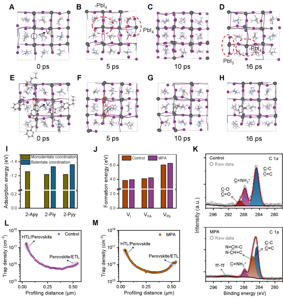 图2 MPA策略功能机制的理论模拟和实验验证。(A至D)对照薄膜在423 K模拟热退火条件下的快照。(E至H)MPA处理薄膜在423 K模拟热退火条件下的快照,展现增强的结构稳定性与降低的动态无序性。(I)不同配位基序的配体工程化吡啶基分子在钙钛矿表面的吸附能。(J)对照薄膜和MPA处理薄膜中空位缺陷的形成能。(K)退火后对照薄膜和MPA处理薄膜的C 1s高分辨率XPS谱图。(L)和(M)分别为对照组和MPA处理组钙钛矿太阳能电池的深度依赖性陷阱密度分布图。