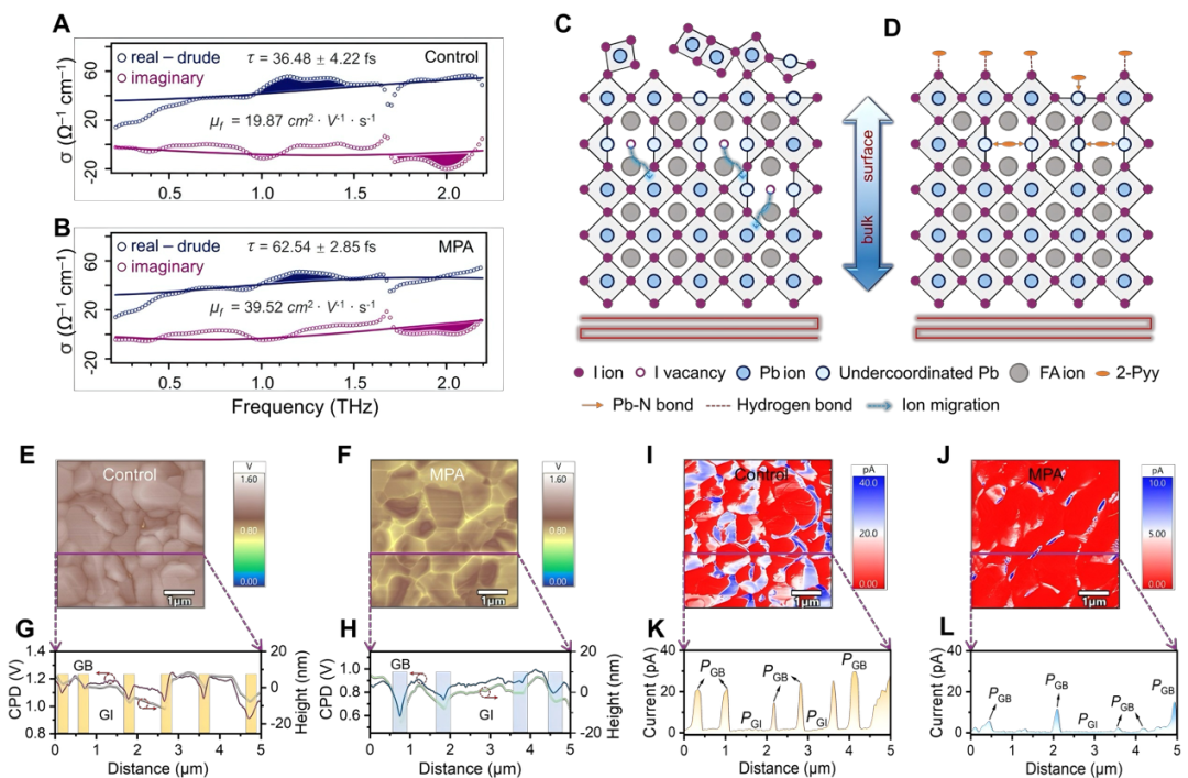 图3 钙钛矿薄膜质量和降解机制的表征。(A)和(B)分别为对照组(A)和MPA处理组(B)薄膜的太赫兹光电导谱。(C)和(D)分别为常规退火与MPA策略及功能机制过程中钙钛矿降解路径的示意图。(E)和(F)分别为对照组和MPA处理组薄膜的开尔文探针力显微镜表面电势图。(G)和(H)分别为沿(E)和(F)中紫色标记线的线扫描轮廓图。(I)和(J)分别为对照组和MPA处理组薄膜的导电原子力显微镜电流图。(K)和(L)分别为沿(I)和(J)中紫色路径的线轮廓图。