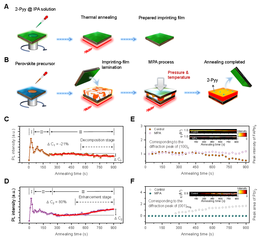 图1 MPA工艺及钙钛矿薄膜退火过程中的实时表征。(A)2-Pyy压印薄膜的制备过程。(B)钙钛矿退火过程中MPA的工艺流程。(C)和(D)分别为对照组和MPA处理组钙钛矿薄膜的原位光致发光强度随退火时间的变化曲线。(E)对照组和MPA处理组FAPbI3钙钛矿衍射峰的时间分辨原位XRD强度演变曲线,插图为强度映射图像。(F)PbI2衍射峰的积分强度随时间的变化。
