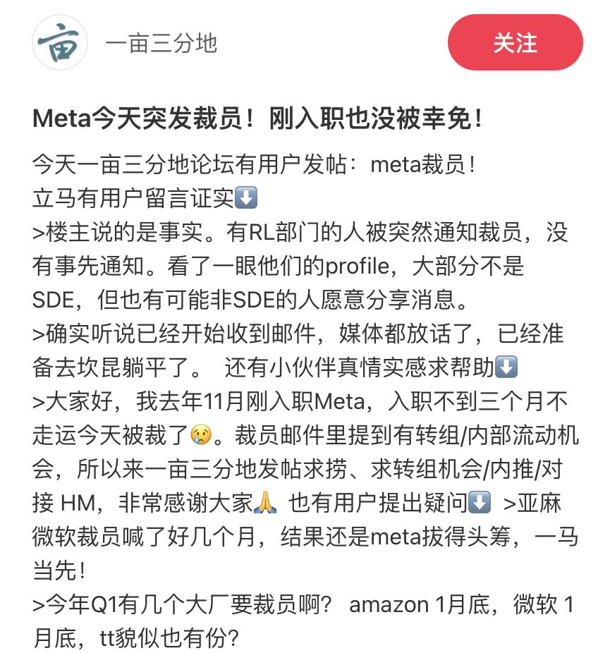 有受影响的Meta员工在海外华人社区表示,自己突然收到了裁员通知。