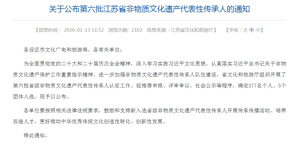 3、【新增48人!我市省级非遗传承人队伍进一步扩大】从无锡市文广旅游局了解到,1月13日,江苏省文旅厅公布了第六批省级非遗代表性传承人名单,经过推荐申报、评审审议、社会公示等程序,确定了377名个人、5个团体入选。我市共有48人入选,涵盖了传统音乐、传统戏剧、传统美术、传统技艺、传统医药五大类别18个非遗项目,新增人数在全省处于前列。至此,我市省级非遗代表性传承人总人数达到了94人。