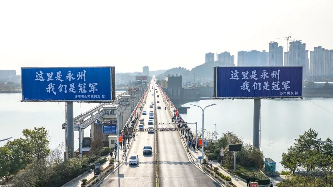 2026年1月3日,冷水滩区宋家洲大桥桥头,一块蓝色广告牌悄然立起:“这里是永州,我们是冠军!苏州网友贺”。南京网友不甘示弱,立刻在旁立牌:“多省省会南京网友贺”。