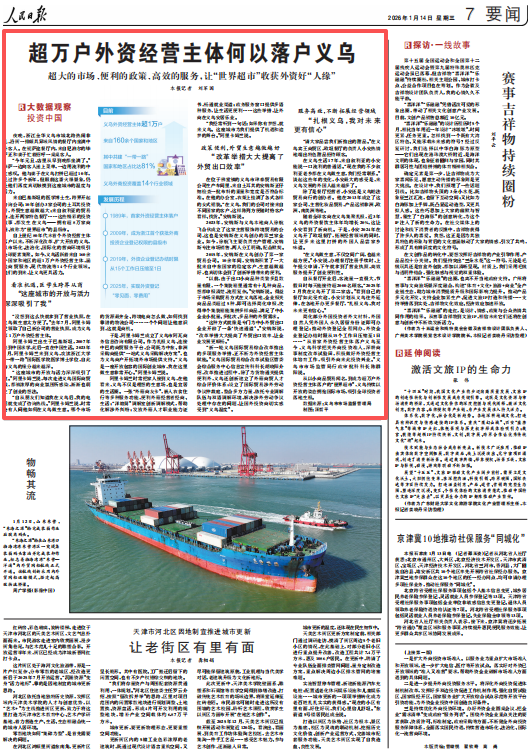 1月14日,《人民日报》刊发《超万户外资经营主体何以落户义乌 超大的市场、便利的政策、高效的服务,让“世界超市”收获外资好“人缘”》一文,聚焦金华义乌深化改革、扩大开放,以市场化、法治化、国际化营商环境吸引全球要素集聚的实践。
