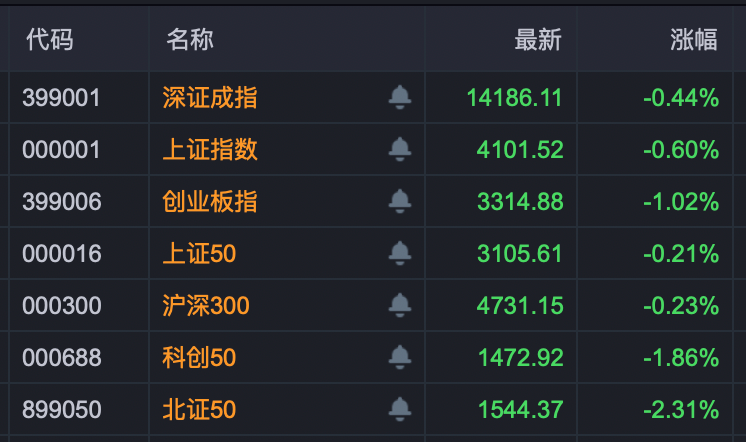 今日早盘,A股市场呈现低开震荡调整态势,上证指数下探4100点支撑位,科创50指数开盘即跌破1500点,深证成指、北证50、创业板指同步走弱。市场内下跌个股数量远超上涨个股,成交规模出现显著萎缩。