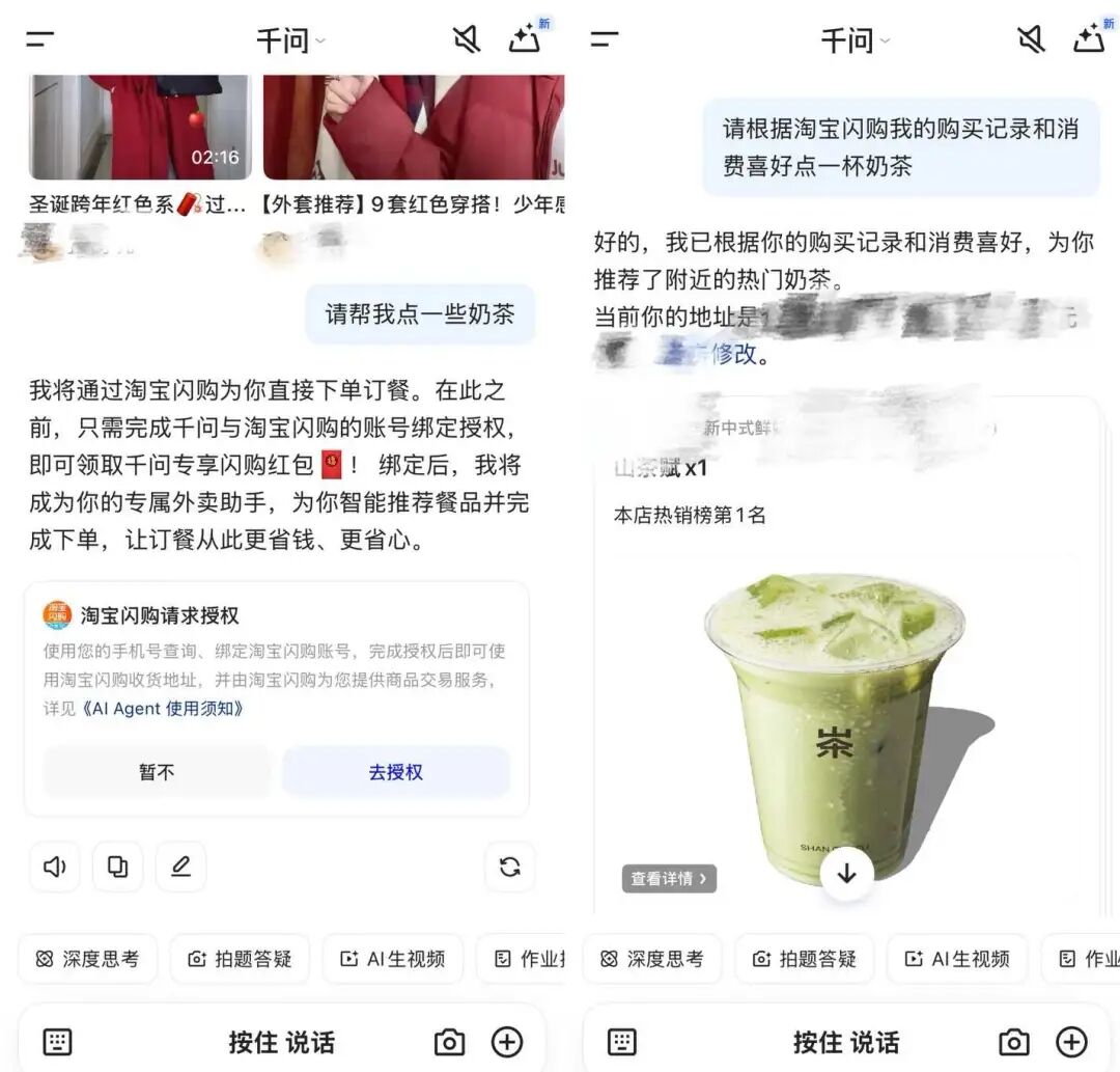 图:升级后的千问APP执行“点奶茶”指令 来源:千问APP《听筒Tech》截图