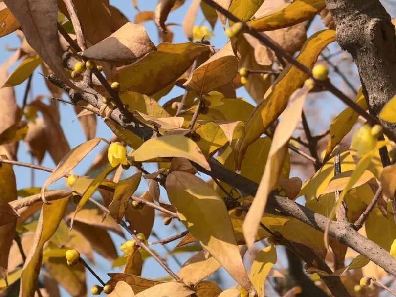 这一现象主要和上海的气温相关。通常来说,蜡梅是先落叶后开花的植物,老叶脱落之后花朵才会绽放,但今年上海冬季低温天气持续时间短、气温偏高,导致叶片脱落延迟,而花芽因低温刺激提前开放,于是就形成了花叶同株的景象。