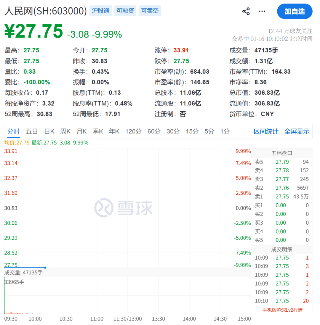 人民网此前收获4连板,今日竞价阶段就跌停,截至发稿卖一位置超43万手卖单。
