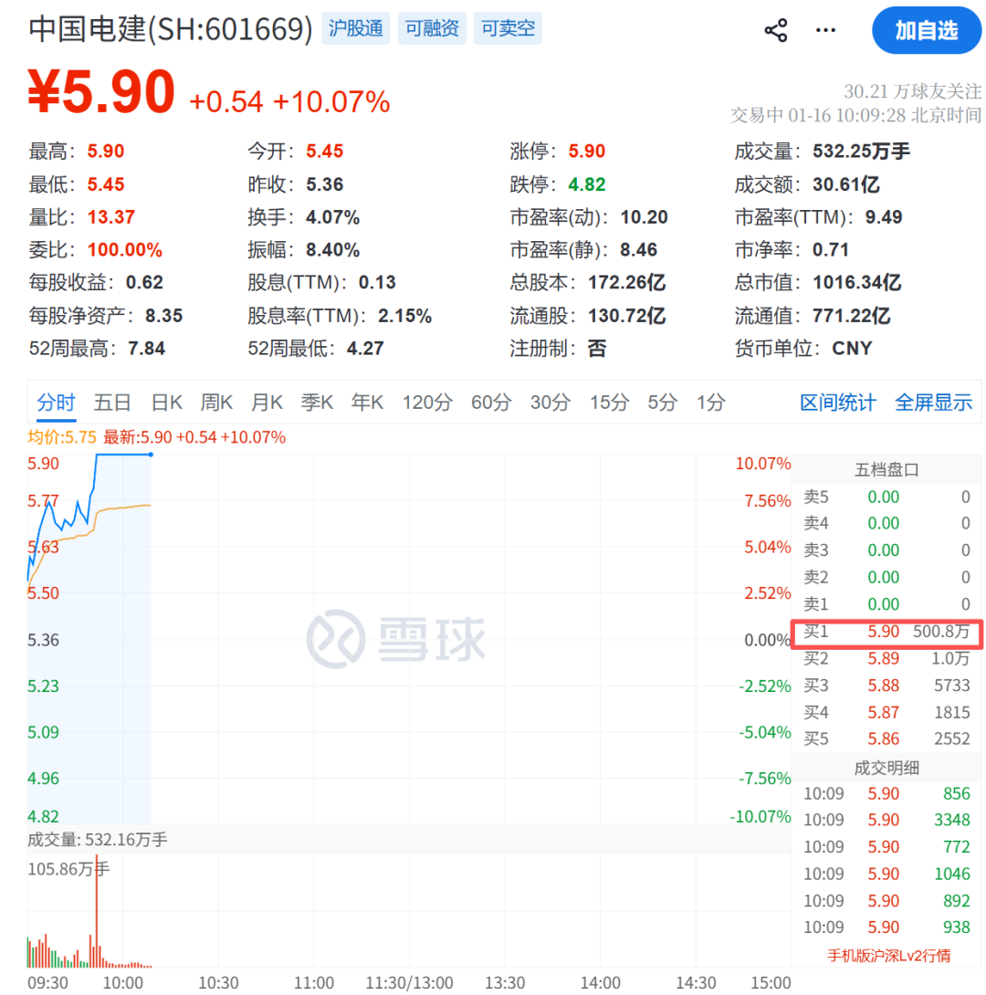 千亿市值的中国电建强势涨停,买一位置超500万手买单。