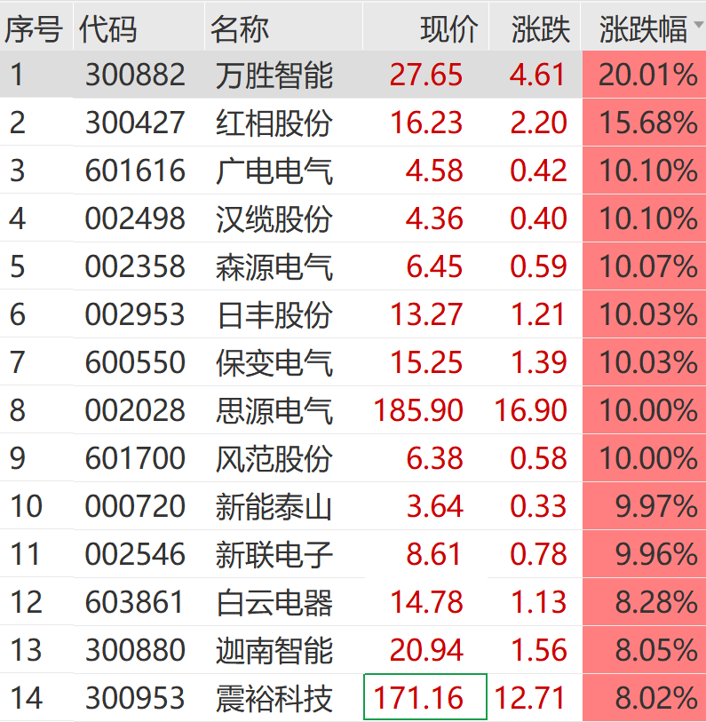 个股方面,万胜智能收获20cm涨停,保变电气、广电电气、森源电气等多只个股也纷纷涨停。