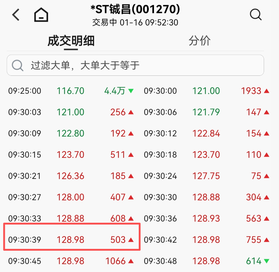 早盘,*ST铖昌以116.7元/股的跌停价开盘;开盘后股价直线冲高,不到1分钟就拉至涨停板。截至发稿,*ST铖昌报128.98元/股,仍维持涨停状态;总市值达266亿元。