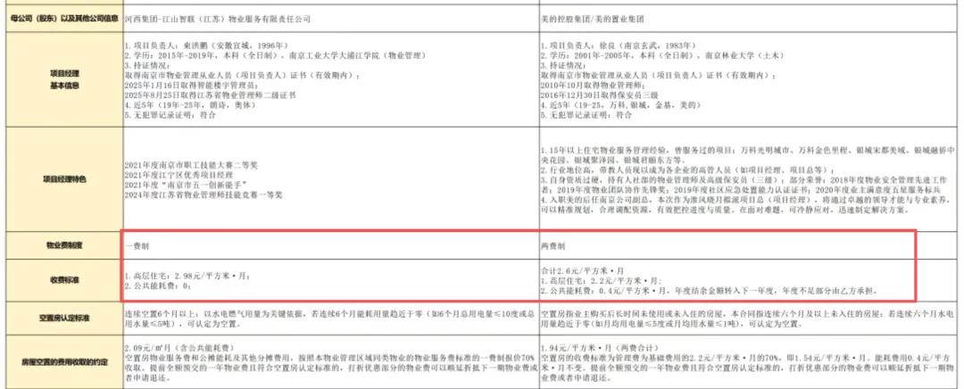 两家候选企业的带资方案各有特点:奥体物业承诺无偿投入140万元,另加约40万元项目焕新资金,若服务期未满解约则按剩余年限退还部分资金;实行2.98元/㎡/月一费制,空置超6个月房屋物业费七折。美的物业带资120万元,70万元需在入驻60天内打入业委会账户,采用两费制合计2.6元/㎡/月,空置房总体约七五折。