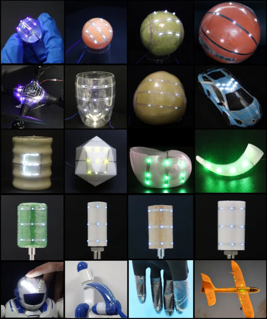 借助这项技术,原本处于平面状态的电路,经过约70摄氏度的温水浸泡或热风处理后,无论是圆润的苹果、流线型的飞机机翼,还是灵活的人体手指,都能按照预先设计的“变形方案”,快速自适应地贴合在这些不同形状的物体表面。
