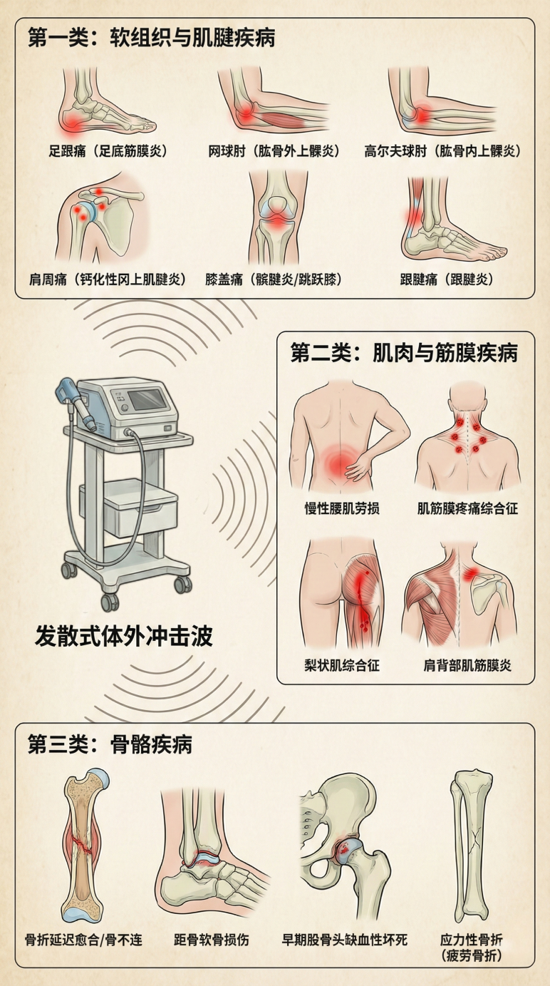 若您正被各类疼痛问题所困扰,冲击波治疗或许能成为您缓解不适的新选择。这是一种借助物理声波作用于患处的治疗手段,主要功效为松解组织黏连、减轻钙化现象以及促进组织修复。同济大学附属同济医院骨科医生提醒,您可通过以下内容初步了解该治疗的适用情况: