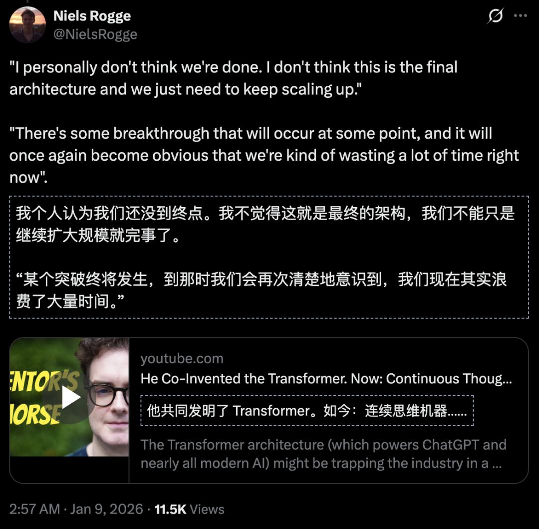 令人不安的是:若他正确,所有埋头改进Transformer变体的人都在浪费时间。混合专家模型、架构微调、注意力机制变体,都可能在新范式出现时瞬间过时。