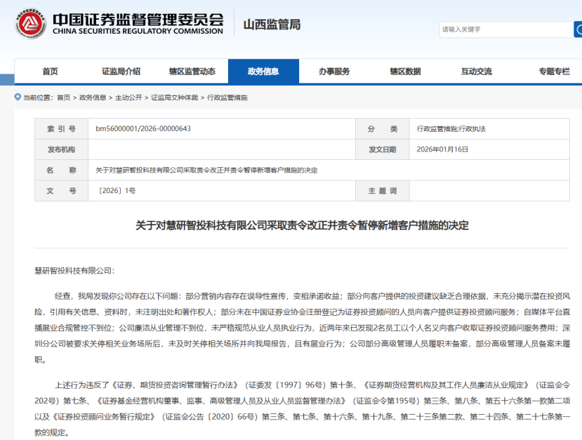山西证监局2026年开年首张罚单指向了投顾机构慧研智投。