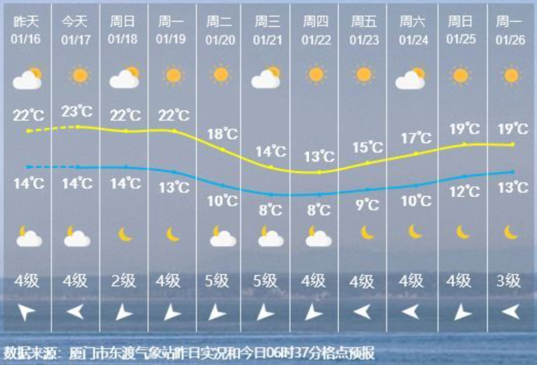 地处东南沿海的厦门,近两日仍维持晴暖,城区最高温22℃—23℃,夜晨最低约14℃,午间局部超25℃,体感舒适。虽距寒潮源地千里,厦门仍会受影响——冷空气翻山越岭后抵达鹭岛时虽难达寒潮级别,但实力仍强劲。20日起,厦门将出现“滑梯式”降温,最低气温降幅5℃—7℃,22日城区最高温降至13℃,夜晨最低仅8℃,同时东北风呼啸,寒意逼人,市民需提前做好防寒保暖。