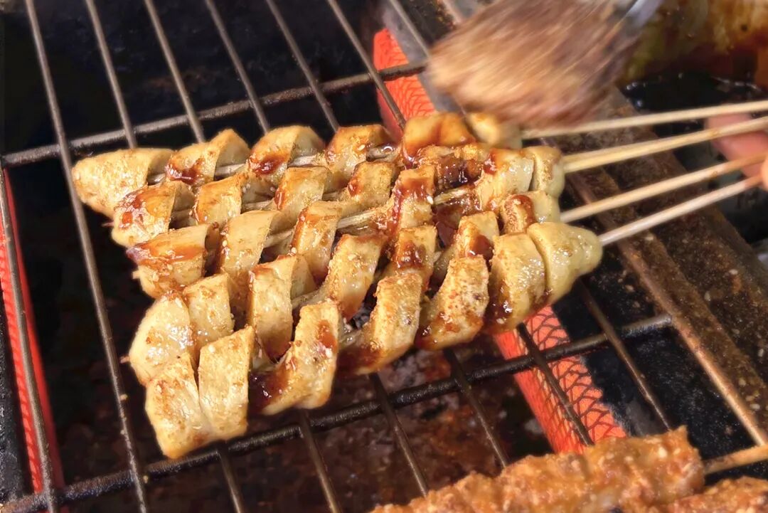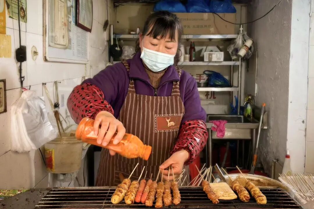 下午3点到晚上7点,是店主张新霞最忙碌的时段。烟熏火燎的烧烤架前,她的脸庞被炉火映得通红,手中翻转的面筋滋滋作响,孜然与甜面酱交织的独特香气四处飘散。