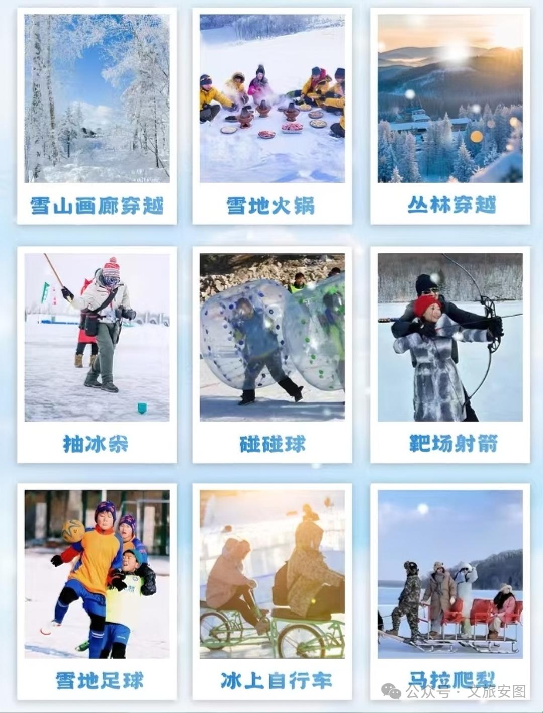 “雪山画廊穿越”:踏雪前行,每一步都是一幅水墨丹青;走进雪山画廊,冬日限定的林海雪原美景尽收眼底;“林海探幽 丛林穿越”:穿梭在林间雪道,与冬日林海亲密接触;“雪原弯弓 靶场射箭”:拉弓、瞄准、发射!在冰天雪地中化身“神射手”,体验百步穿杨的乐趣;“冰河旋影 抽冰尜”:挥起鞭子,抽打冰尜旋转,瞬间找回童年的冬日快乐;“碰碰狂欢 碰碰球”:钻进碰碰球,在雪地上碰撞嬉戏,摔倒也不怕,雪地是最好的缓冲;“冰上飞驰 冰上自行车”:骑上冰上自行车,车轮碾过冰面,享受追风逐雪的畅快,偶尔的“失控漂移”更是趣味十足;“雪地足球”:在白雪覆盖的“绿茵场”上奔跑,传球、射门、防守,在奋力奔跑中释放冬日活力;“暖锅暖胃 雪地火锅”:在冰天雪地里吃火锅,暖锅驱散寒意,这才是冬日吃火锅的正确打开方式。