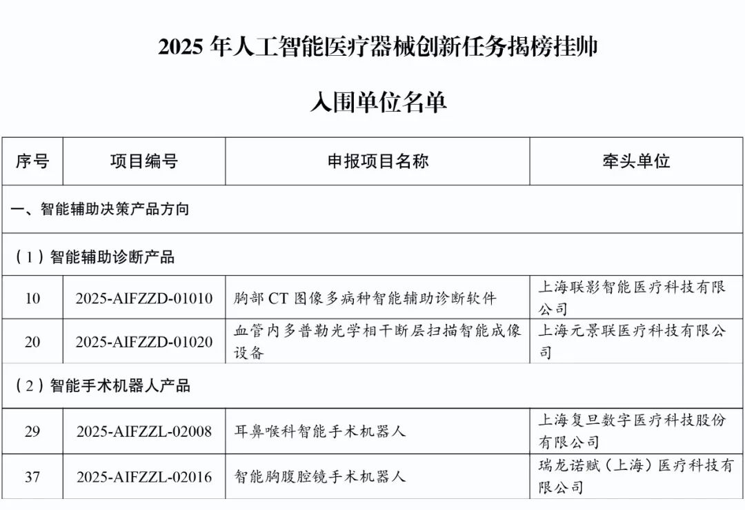 2025年人工智能医疗器械创新任务“揭榜挂帅”入围单位名单节选