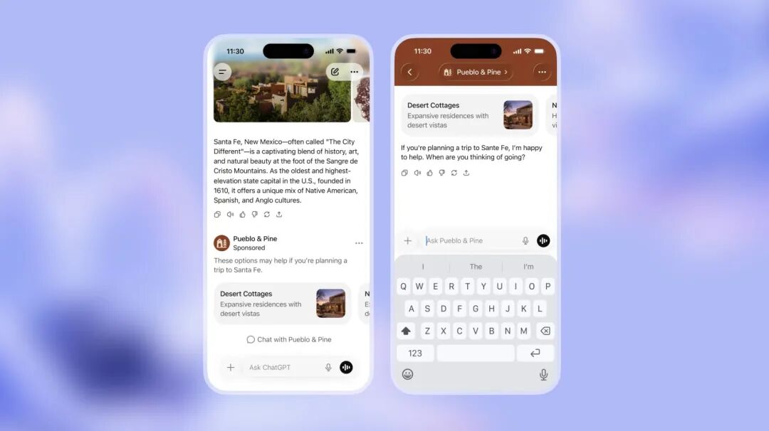 此次广告测试,主要面向美国地区的免费用户,以及新推出的ChatGPT Go(月费8美元)订阅群体。