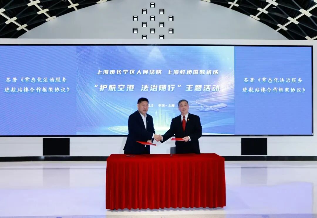 2025年12月,区法院与虹桥机场签署《常态化法治服务进航站楼合作框架协议》,确立法治服务巡回窗口、普法宣传等五项机制,助力机场打造国际航空枢纽。