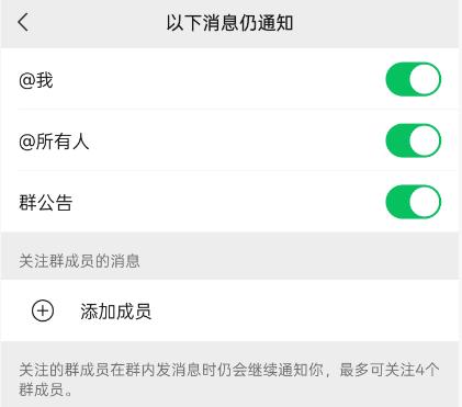 可勾选「@我」「@所有人」「群公告」,还能设置最多4位特别关注成员,他们发言会提醒。