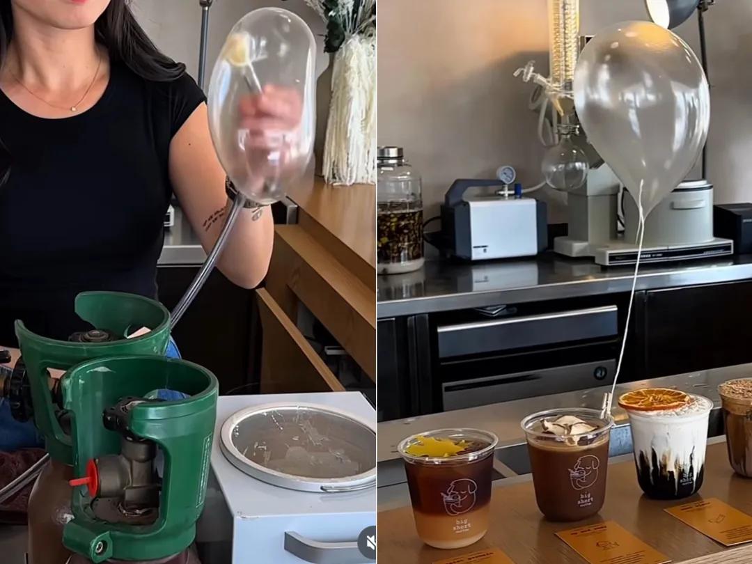 为了应对气球的“不稳定性”,许多咖啡馆采用双人协作的方式,一人专注吹制,另一人则“轻、快、准”地将成型的气球固定在杯口处。