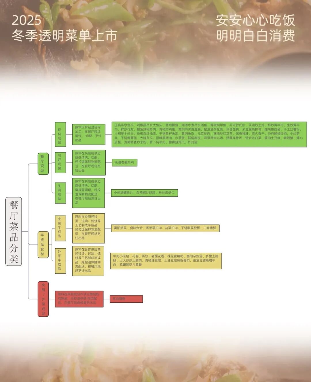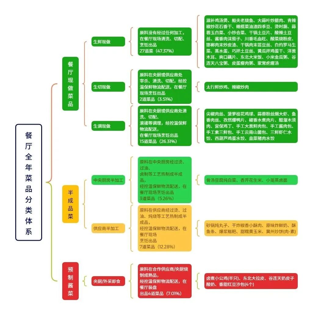 之后,谷连天推出了三项透明化举措:首先是菜单分类公示,把57道菜品分成三类:餐厅现做(43道),食材是生鲜状态,在餐厅现场制作;半成品菜(10道),食材初步加工成半熟状态,冷链送到餐厅完成烹饪;预制酱菜(4道),原料由合作供应商或央厨做成成品,控温配送后在餐厅装盘出品。