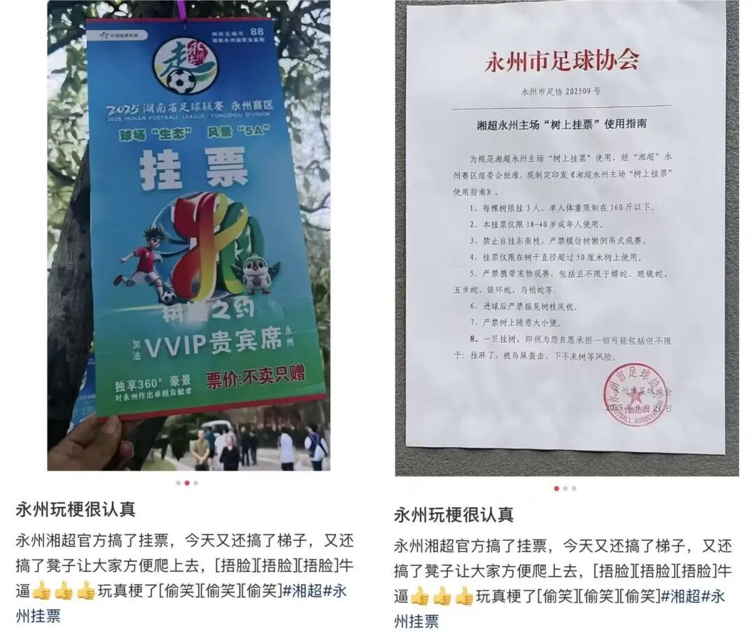 首个主场比赛门票秒光,有网友调侃要买“挂票”爬树观赛。没想到永州市足协真的发布《“树上挂票”使用指南》,规定每棵树限3人、禁止倒吊、严禁带蛇观赛。官方玩梗,把城市运动热情推向高潮。