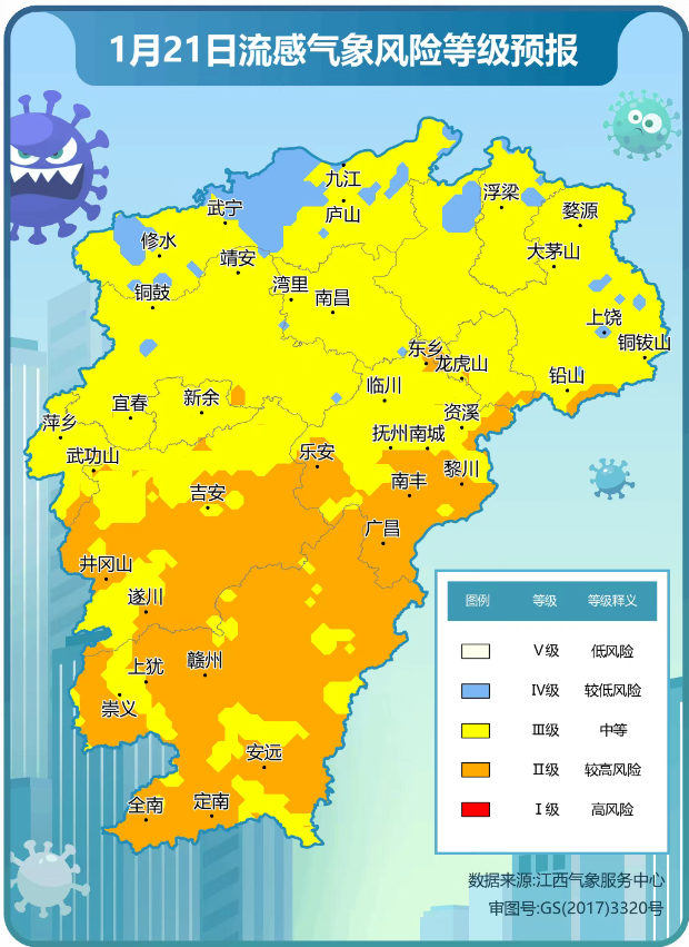 预计19日20时至20日20时,全省大部流感气象风险较高;21日,吉安、赣州及抚州部分地区风险较高。
