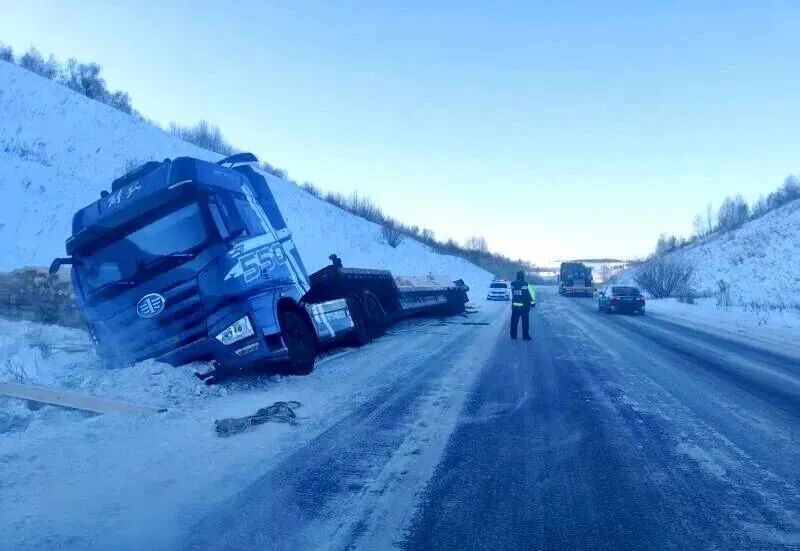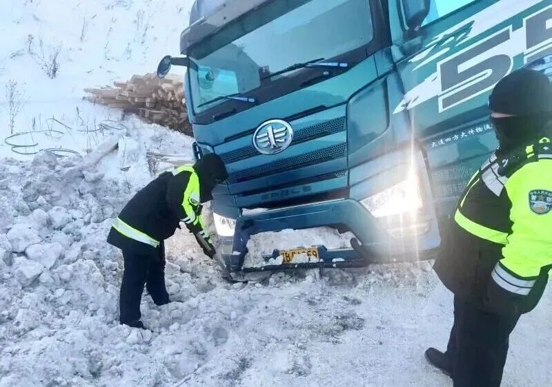 呼伦贝尔市新巴尔虎左旗最低气温达-40℃,风吹雪让出行寸步难行。当地交警巡逻时发现一辆重型半挂货车因操作不当侧滑入沟谷,车头严重受损。交警迅速确认驾驶员安全,划定警戒区、摆放警示标志,引导车辆避让。随后与救援人员协作,在车轮下铺防滑沙和木板,克服绳索结冰的困难,经两小时紧张施救,成功将货车拖回路面。